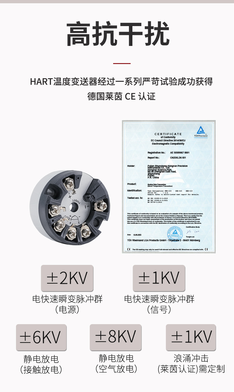 虹潤公司是專業生產溫度變送器的國家專精特新“小巨人”企業。生產的智能溫度變送器,具有適配各類溫度傳感器,精度高,穩定性好,通過編程線修改輸入信號類型及量程,高抗干擾等特點。該產品不僅通過HART基金會認證、德國萊茵 CE 認證與 SIL 功能安全認證,還獲得具備減震抗干擾能力的溫度變送器、信號隔離器、一種二端子模塊、無源信號隔離器等4項國家發明專利,主持起草物聯網智能溫度儀表、現場設備工具(FDT)接口規范、工業過程測量和控制系統用溫度變送器等3項國家標準,以及通信系統多通道數據采集控制終端規范軍用標準,參與國際5G標準制定,取得智能溫度變送器、HART溫度變送器等3項相關軟件著作權。產品廣泛應用于石油、化工、電力、冶金、制藥、食品、水處理等各種工業領域。