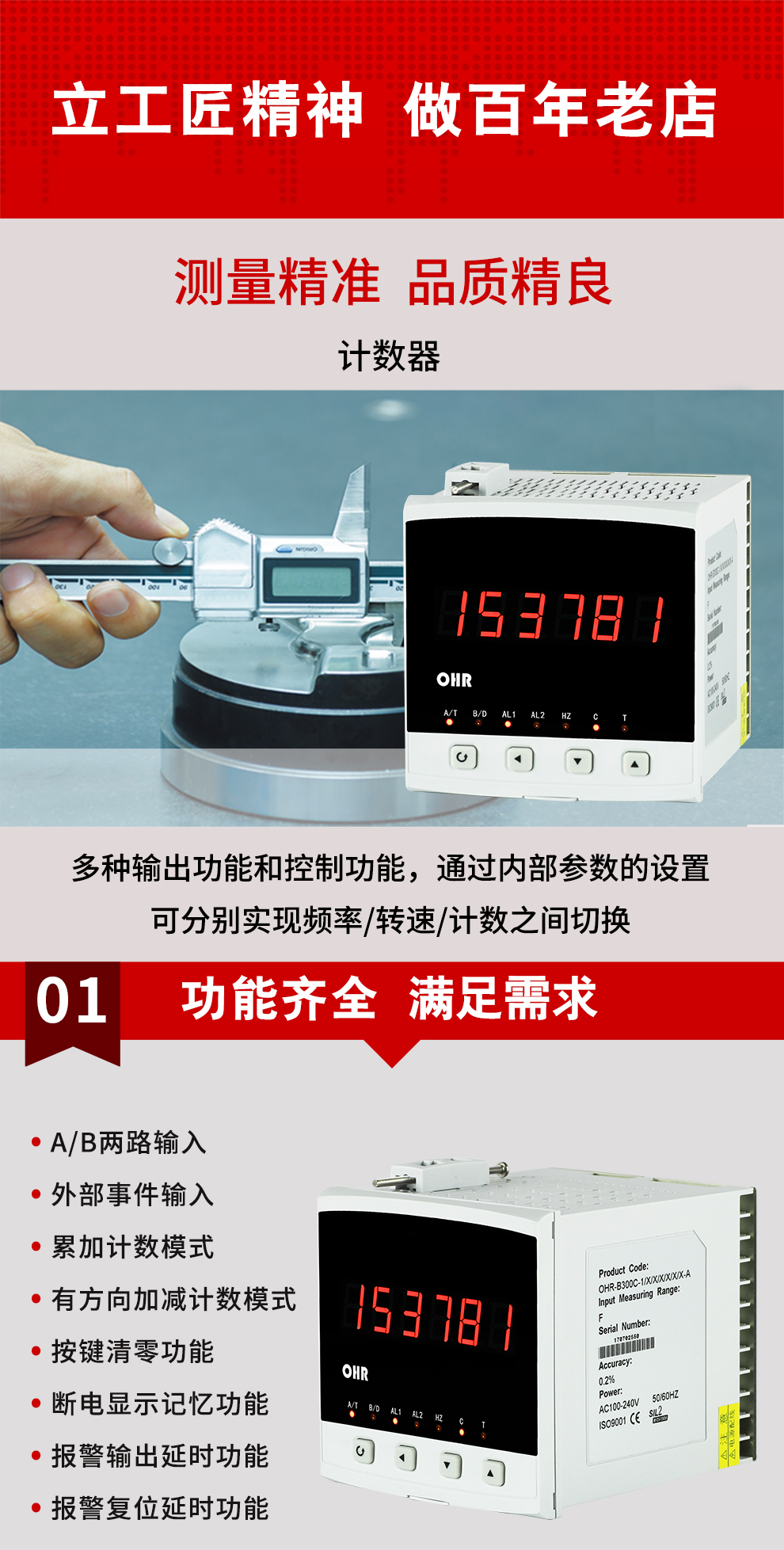 OHR-B300系列計數器采用全自動貼片封裝工藝,具有很強的抗干擾能力,并具有多種輸出功能和控制功能,多種計數模式,廣泛運用于電力、石化、冶金、輕工、制藥、航空等諸多領域。